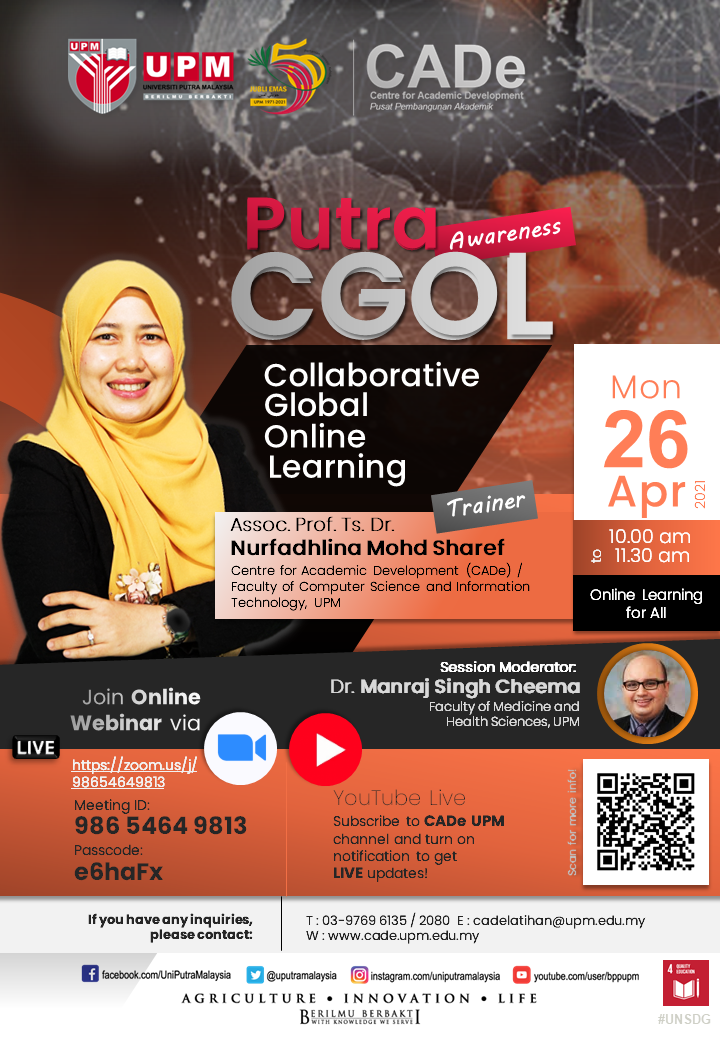 PUTRA COLLABORATIVE GLOBAL ONLINE LEARNING (PutraCGOL) - AWARENESS26 April 2021 (Monday) / 10.00 am - 11.30 amTrainer:
